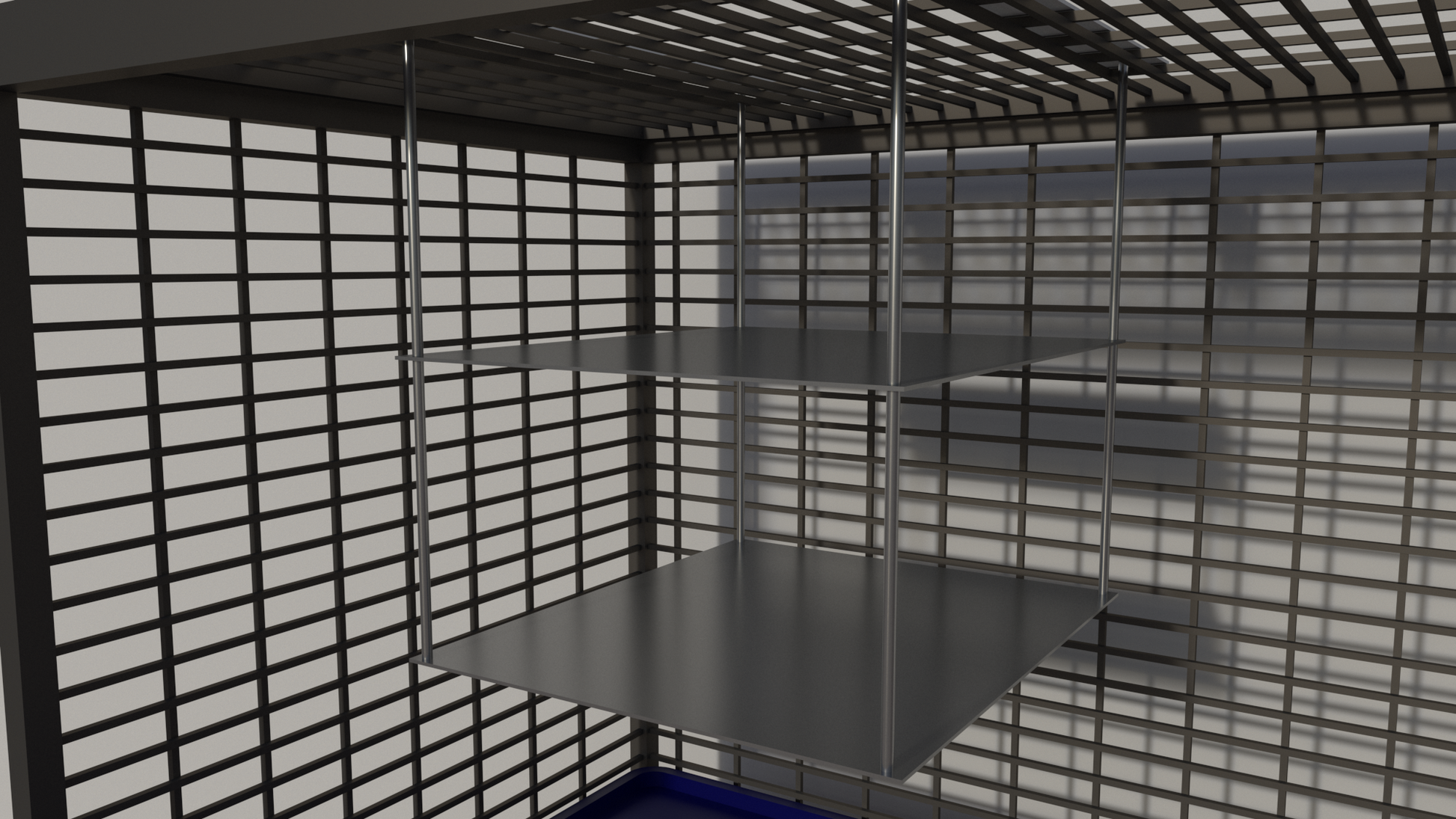Fissaggio: n° 4 colonne (barre filettate) negli angoli con possibilità di regolare le altezze mediante dei dadi ad aletta che si regolano a mano. Altezza colonne 45cm. Si fissa sul tetto della gabbia